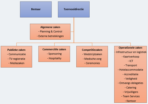 Bij soortgelijke projecten is goede ervaring opgedaan door een projectstructuur te ontwikkelen met vijf hoofdlijnen, te weten: algemene zaken, publieke zaken, commerciële zaken, competitiezaken en logistieke zaken. Iedere hoofdlijn correspondeert met een managementgebied, waardoor het voor de hand ligt het management van het project ook aan de hand van de vijf hoofdlijnen in te richten.